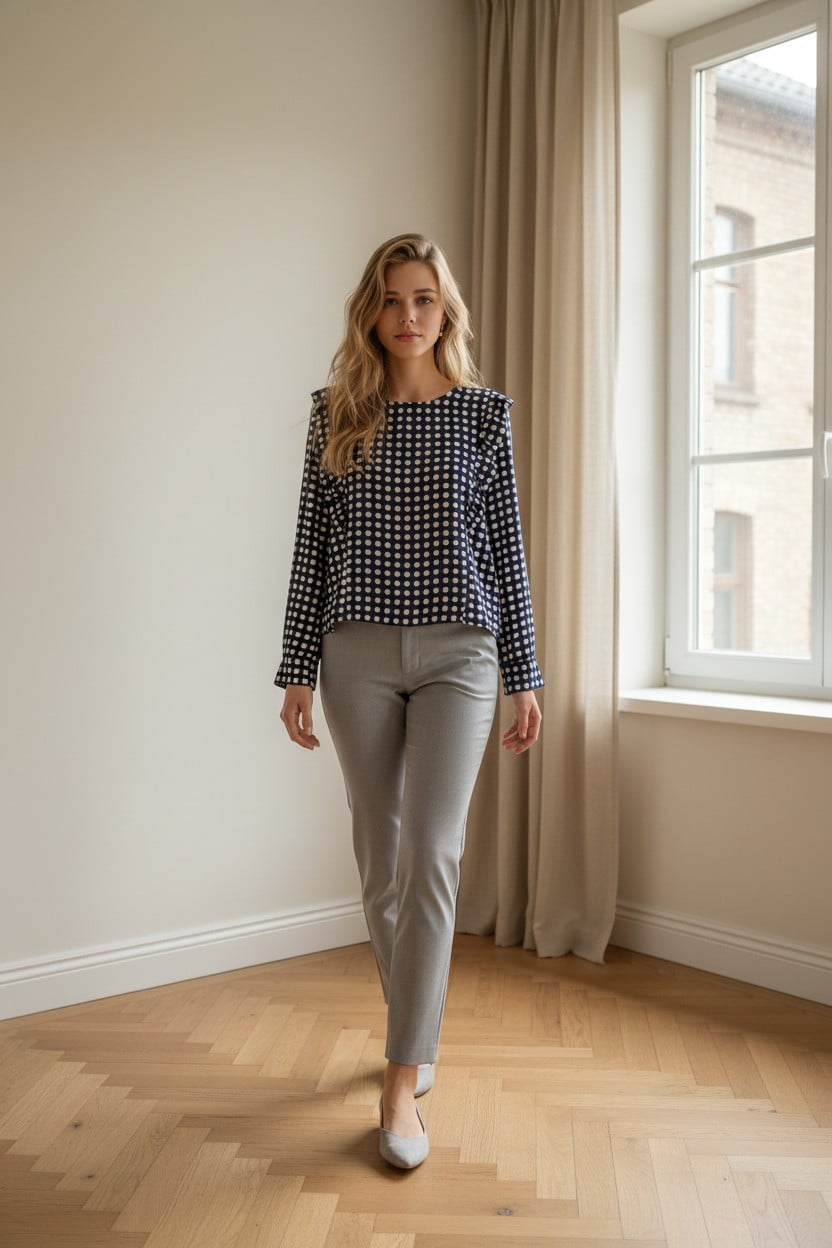 Blusa de manga larga en color azul y en color verde con estampado de lunares blancos. Presenta un corte recto y ligeramente fluido que aporta comodidad y movimiento. Incorpora detalles discretos en los hombros que realzan la silueta. (No es muy larga, en caso de duda comprobar las medidas).