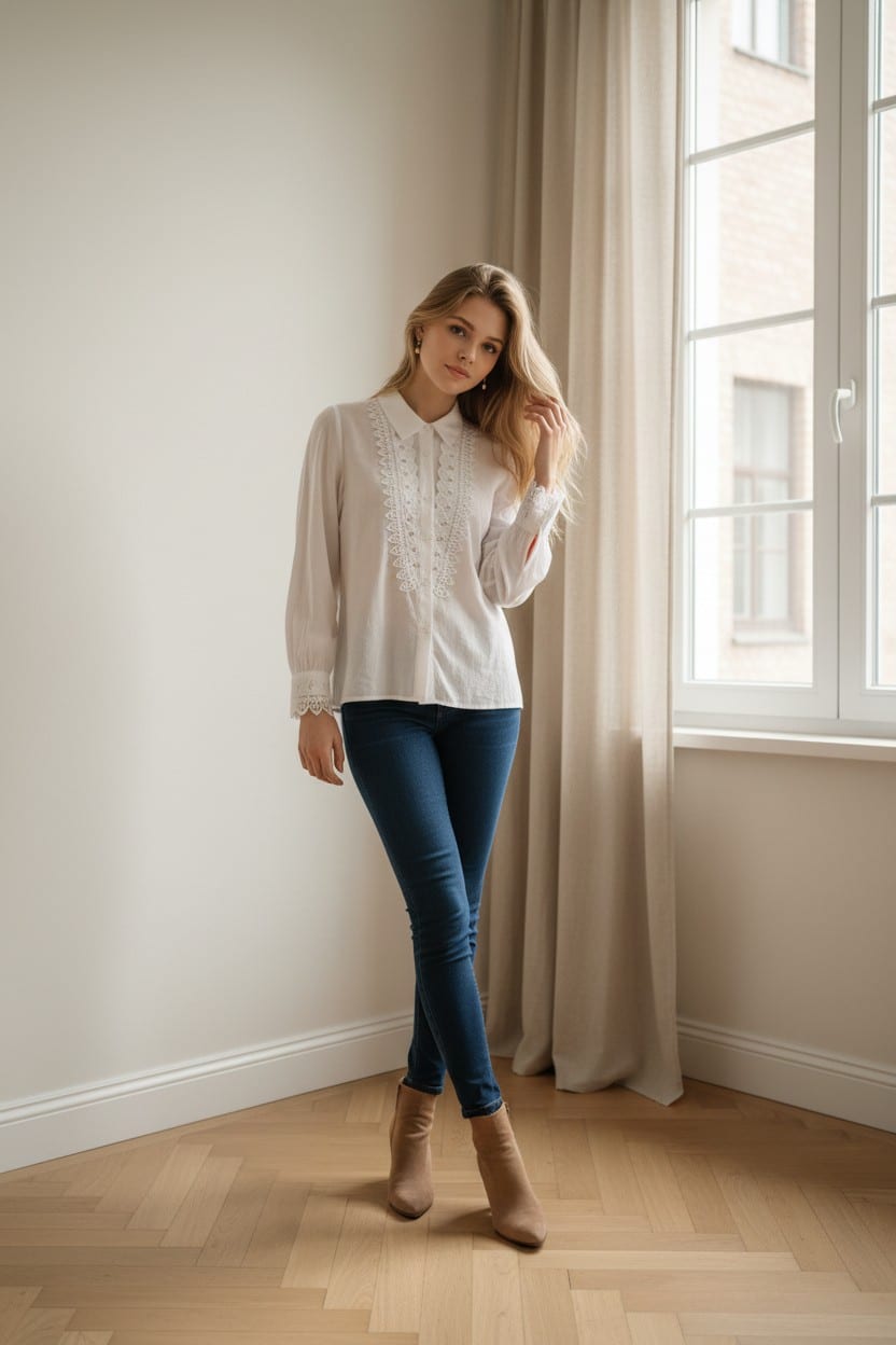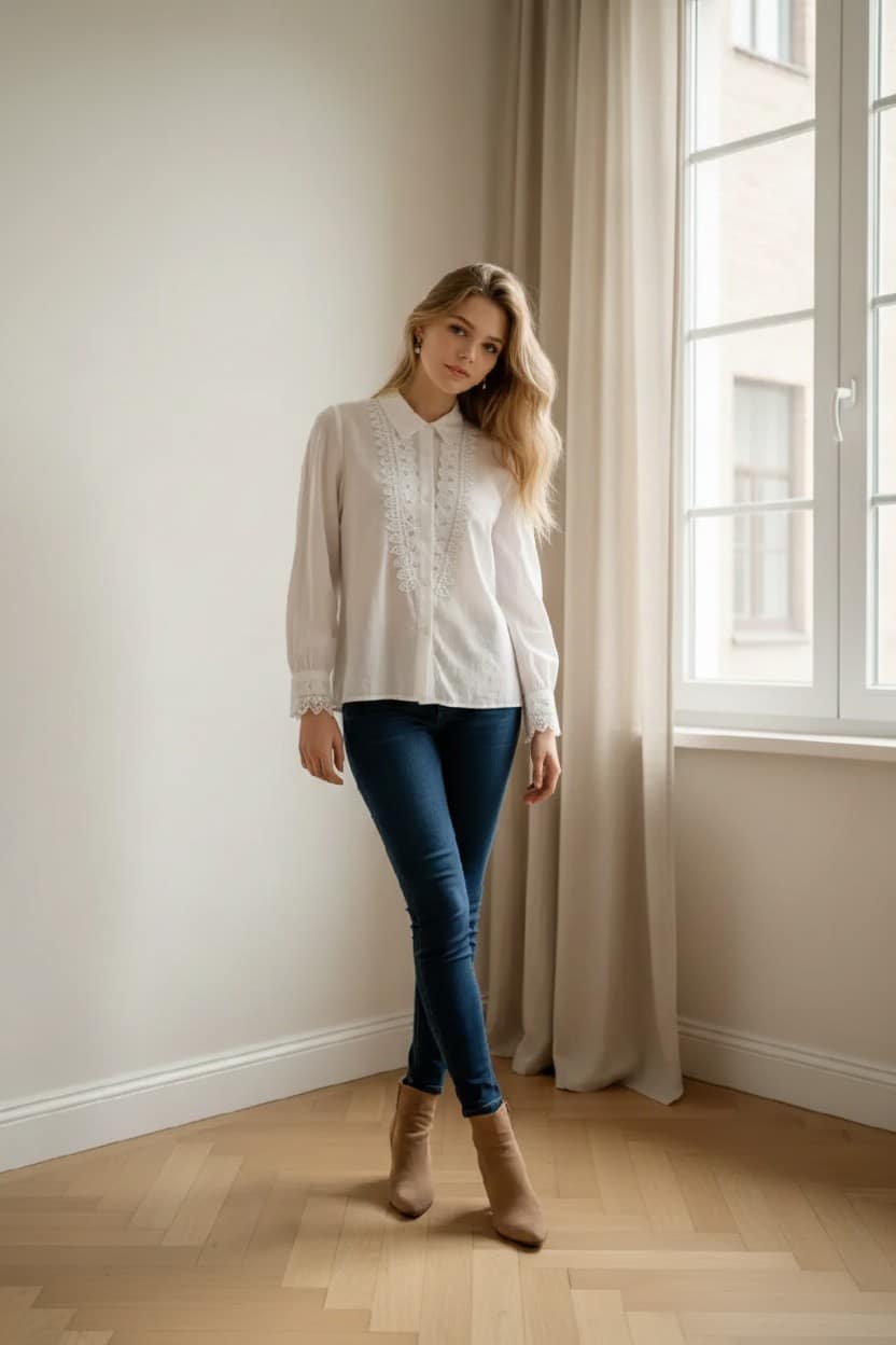 Camisa blanca de tejido ligero y ligeramente semitransparente, diseñada con cuello clásico y cierre frontal de botones. Destaca por sus detalles de encaje bordado en la parte delantera y en los puños, que aportan un aire romántico y sofisticado.