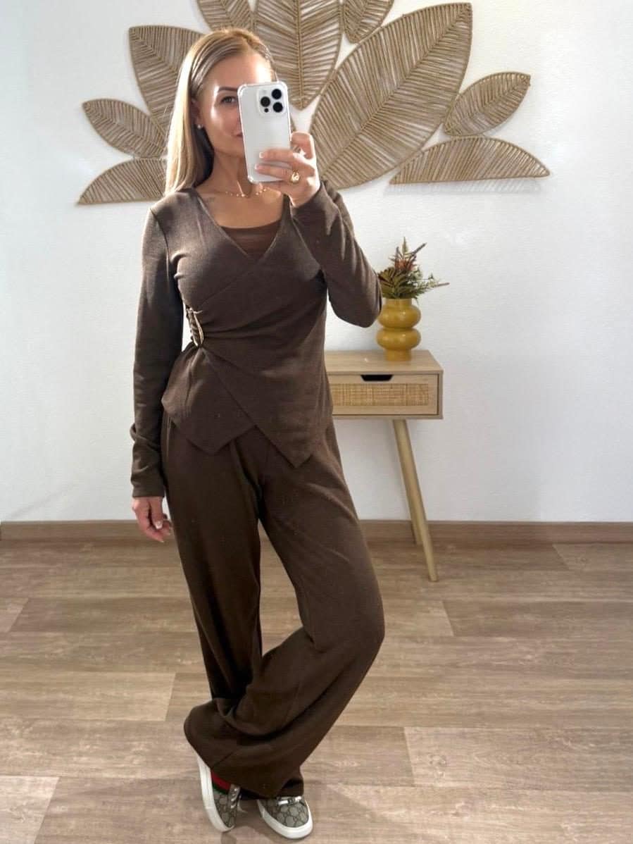 Conjunto de camiseta cruzada y pantalón. La camiseta lleva un detalle lateral dorado, no va forrado y el pantalón de pierna ancha con goma en la cintura. La camisa se vende por separado.