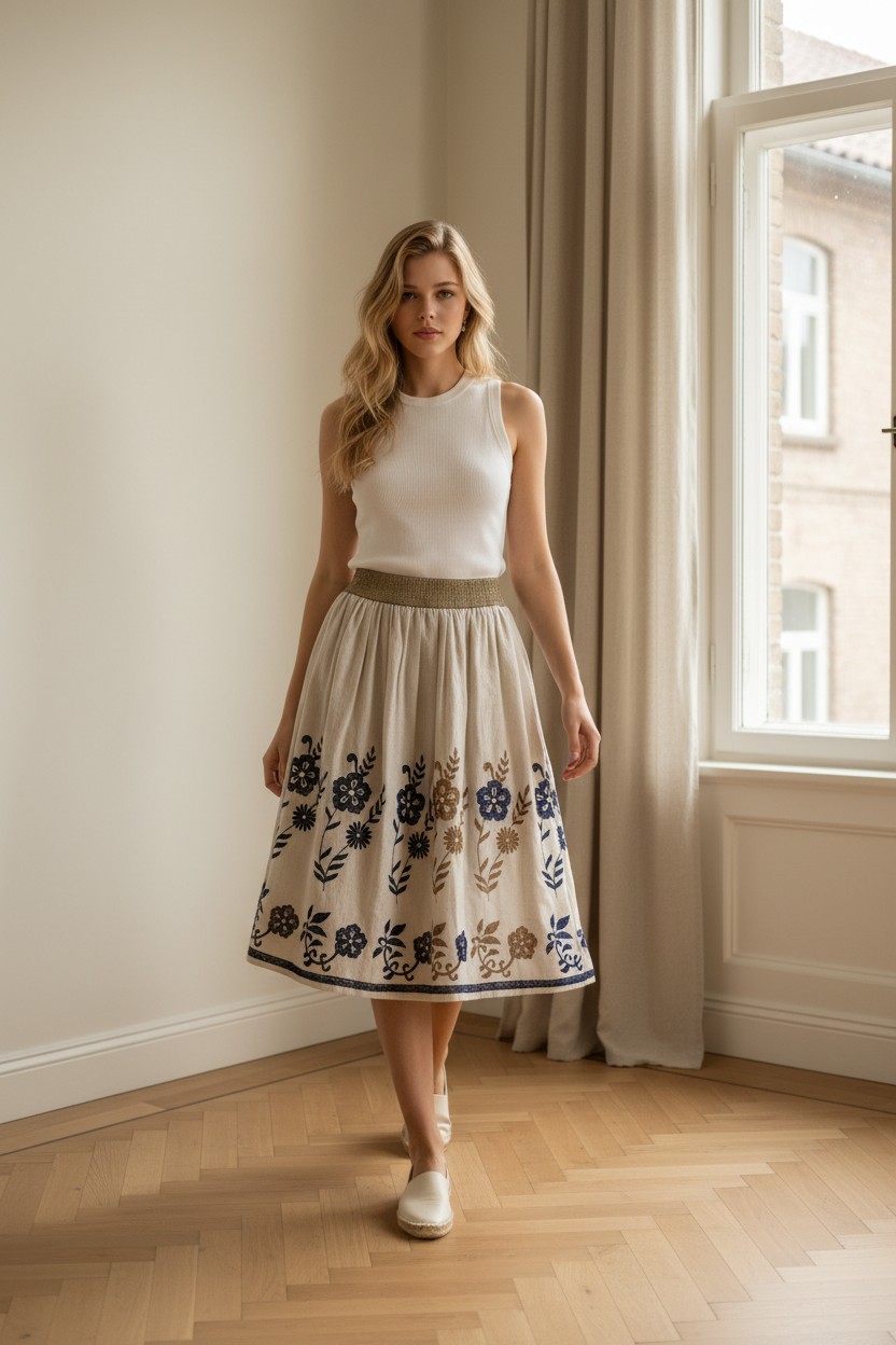 Falda midi beige con flores azules.