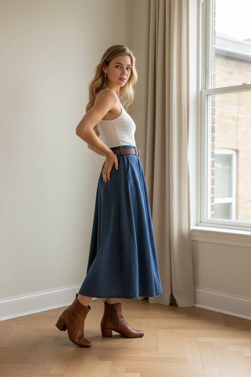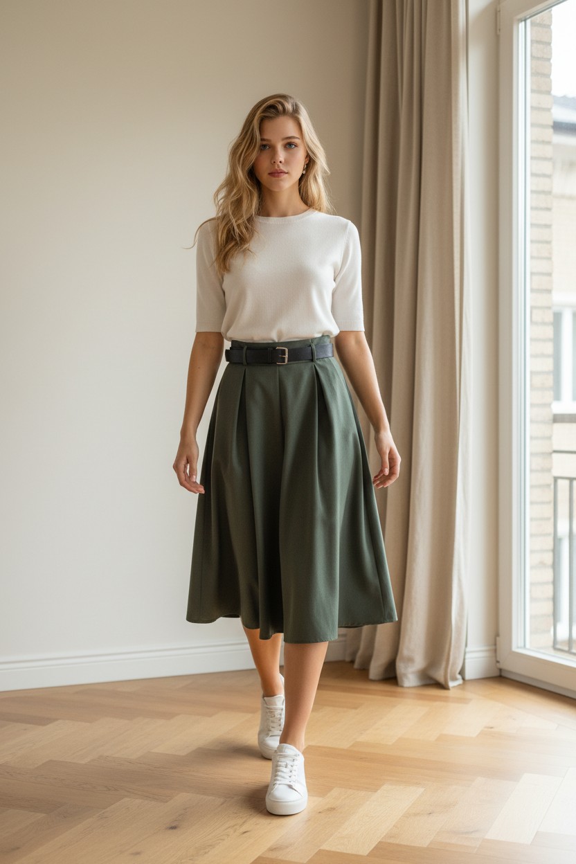 Falda midi con cinturón y bolsillos