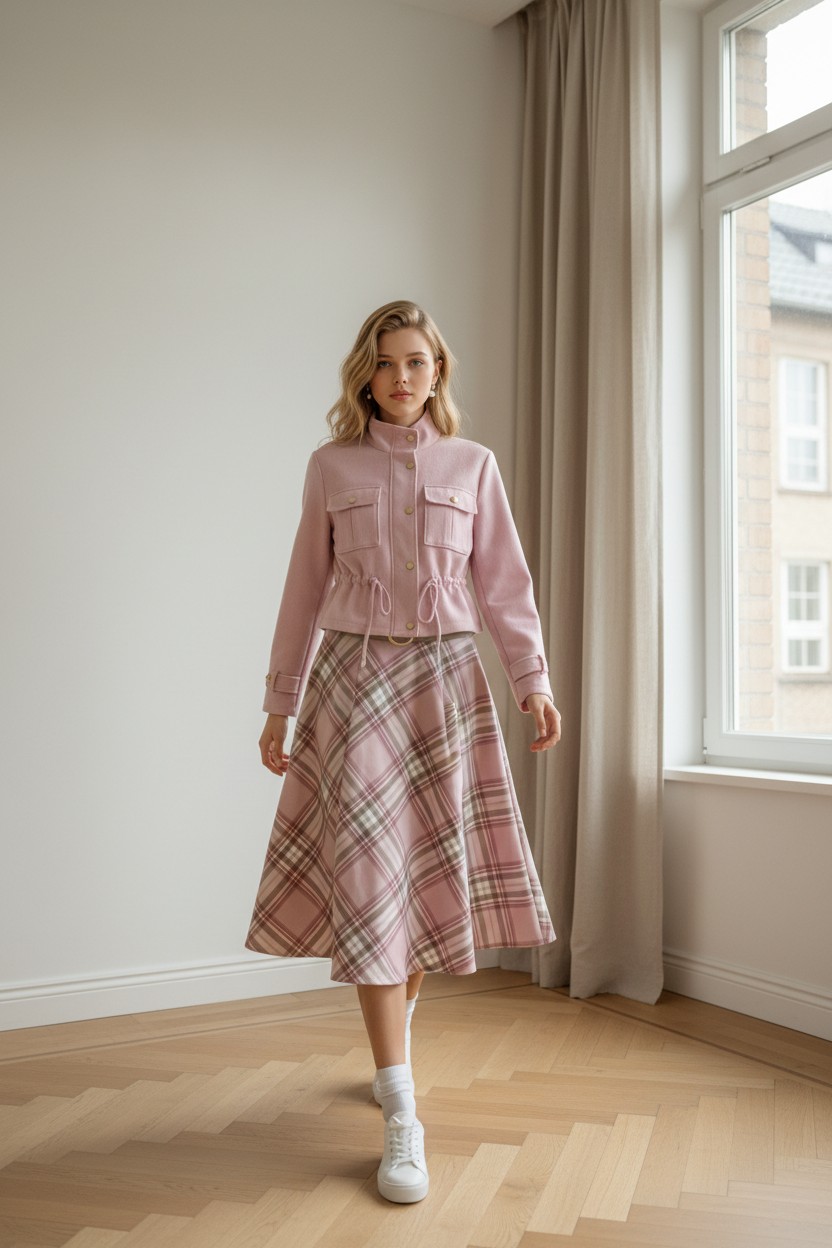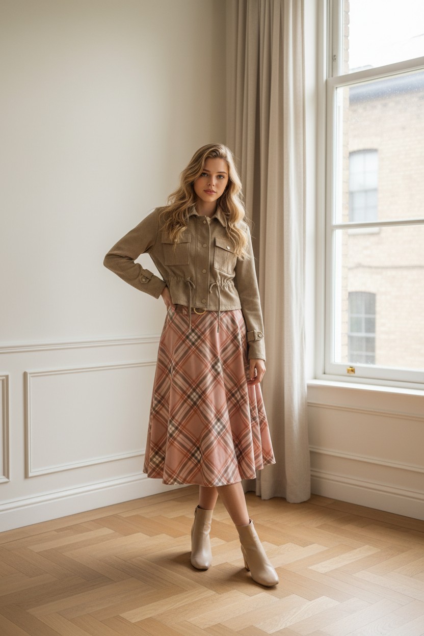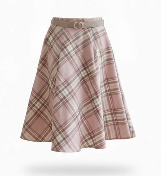 Falda midi cuadros con bolsillos y cinturón en color camel.