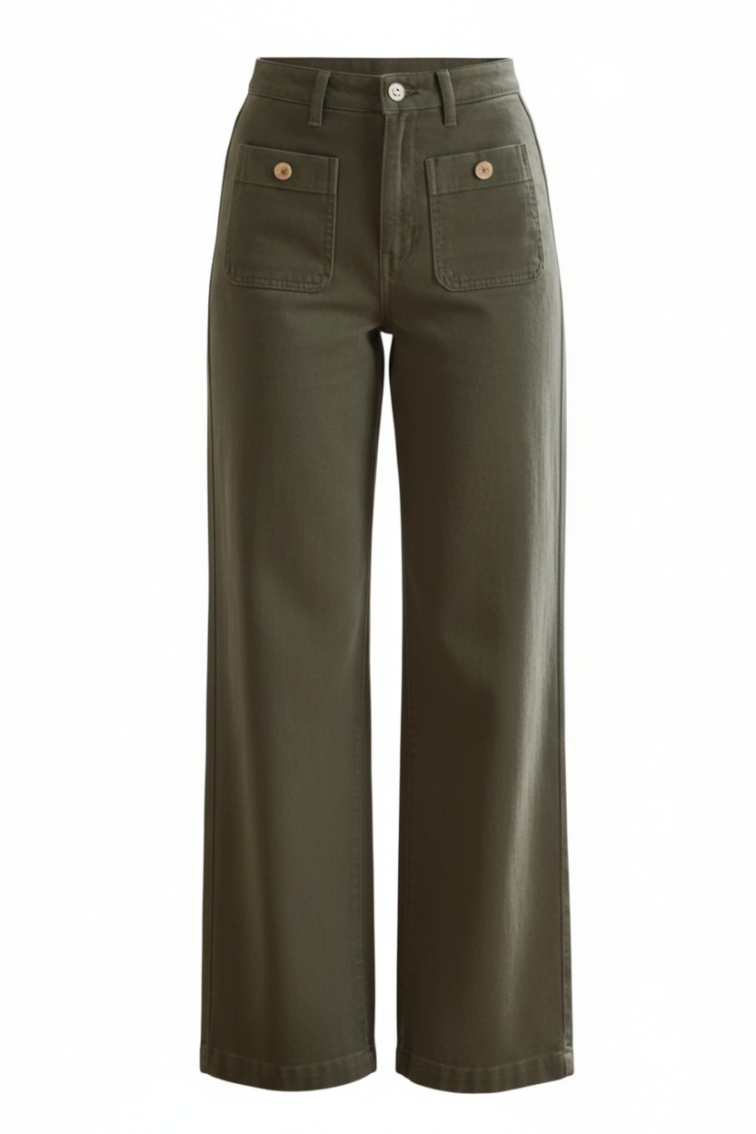 Pantalón vaquero recto bolsillos delanteros y botones dorados.