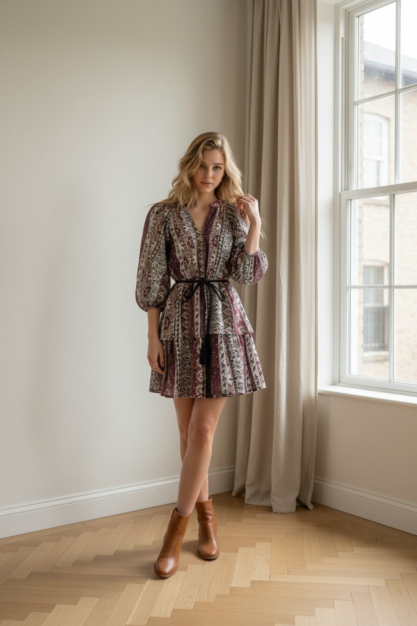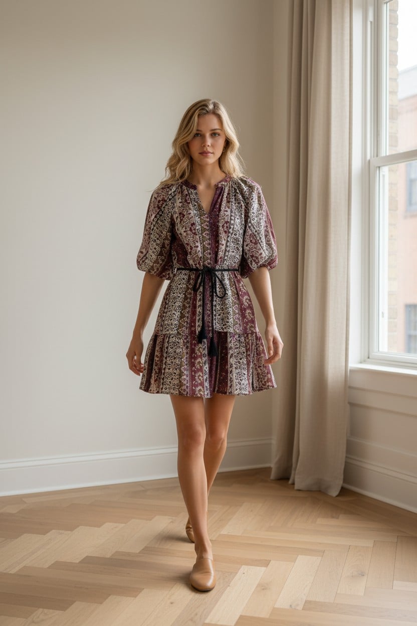 Vestido de gasa bohemio de talla única y color predominante burdeos.