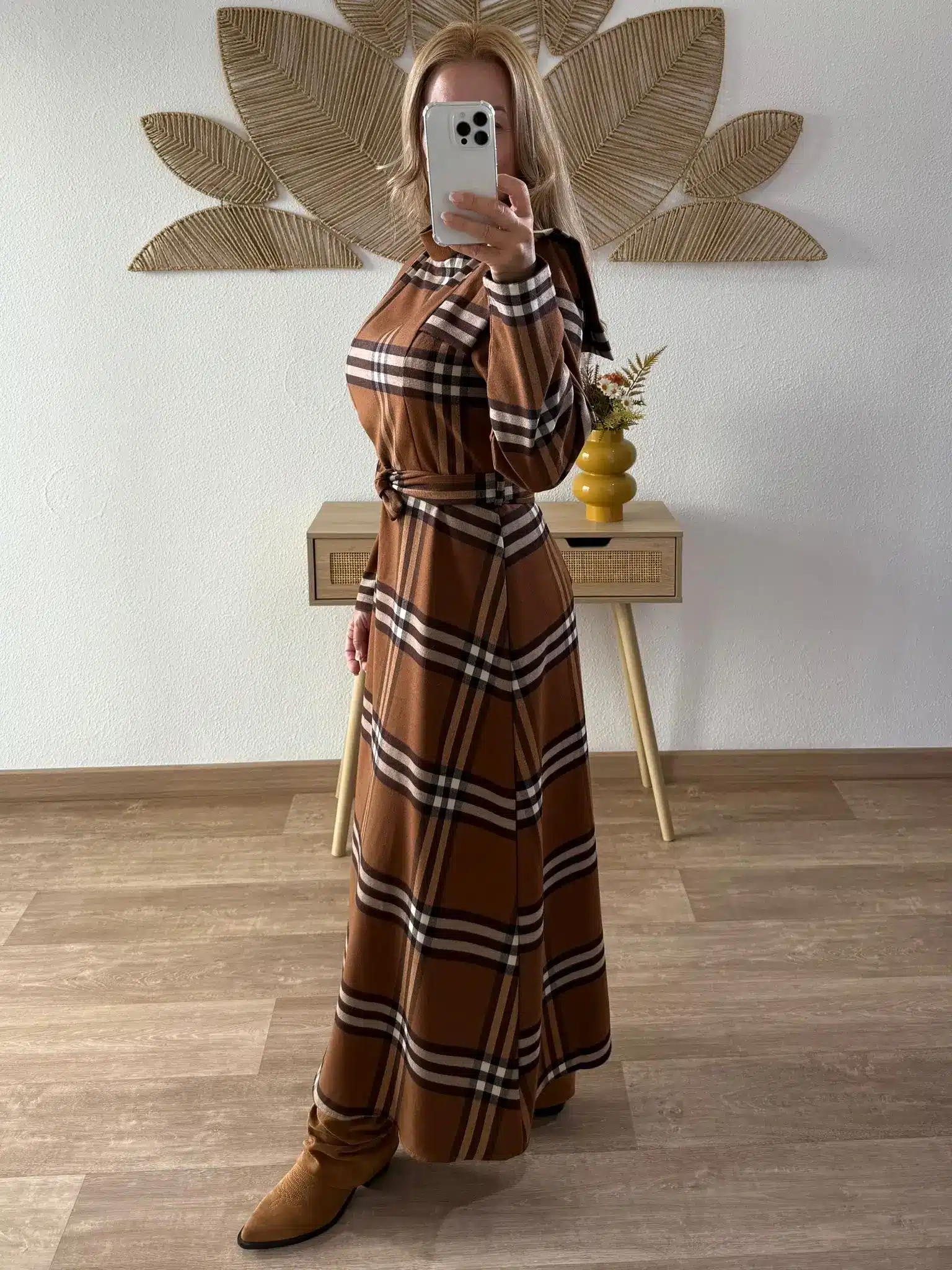 Vestido largo de cuadros con hombreras.